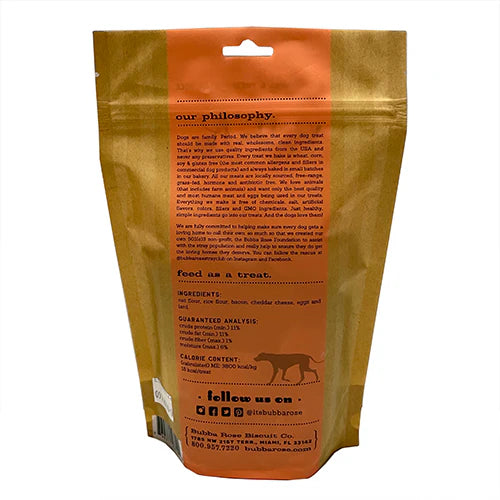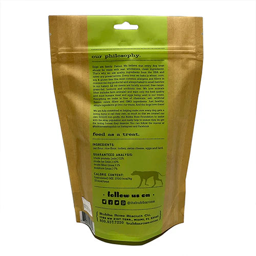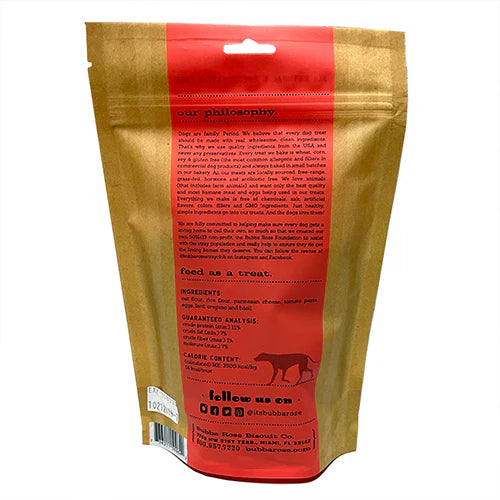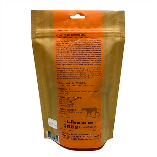 The Bubba Rose Biscuit Co. believes that every dog treat should be made with real, wholesome, clean ingredients. That's why they use local, fresh ingredients from the USA and never any preservatives. Every treat they bake is wheat, corn, soy & gluten free (the most common allergens and fillers in commercial dog products) and always baked in small batches in their bakery in Miami, FL. Their meats are locally sourced, free-range, grass-fed, hormone and antibiotic free. They love animals (that includes farm animals) and want only the best quality and most humane meat and eggs being used in their treats. Everything they make is free of chemicals, salt, artificial flavors, colors, fillers and GMO ingredients. Just healthy, simple ingredients go into their treats. And by the way, the dogs absolutely love them!